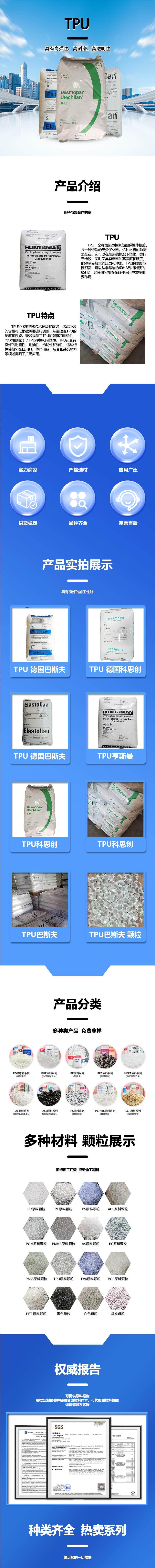 4、耐寒性突出:TPU的玻璃态转变温度比较低,在零下35度仍保持良好的弹性、柔顺性和其他物理性能。5、加工性能好:TPU可采用常见的热塑性材料的加工方法进行加工,如注射、挤出、压延等等。同时,TPU与某些高分子材料共同加工能够得到性能互补的聚合物合金。