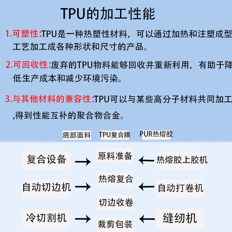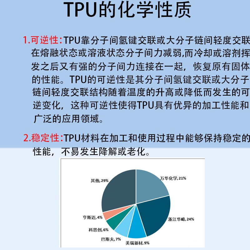 热塑性聚氨酯(TPU)不仅具有交联性聚氨酯的高强度、高耐磨等橡胶特性,而且具备线性高分子材料的热塑性能,从而使其应用得以扩展到塑料领域。尤其是近几十年,TPU已经成为发展 的高分子材料之一。TPU薄膜是TPU材料的一种重要应用形式,近年来随着高科技的发展和进步也得到了越来越广泛的应用。但是由于它的加工难度大且产品不稳定等因素,所以中国内地还没有厂家能进行较好的批量生产。TPU 材料的生产主要分布在美国、西欧、日本,中国的台湾地区也占有一定的比例。国际上代表性的有Bayer公司、Dow 公司、Mobay公司、Dupont公司等 国内TPU生产厂商有天津市塑料集团有限责任公司、山西省化工研究所聚氨酯橡胶厂、烟台华大化学有限公司等