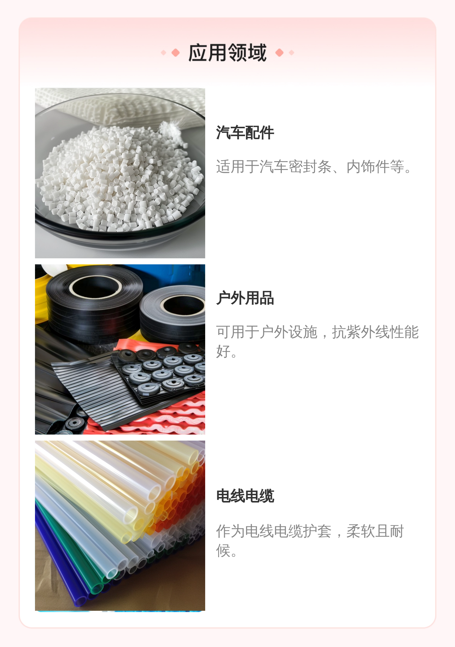 | THERMOLAST K TP6VCN (Series: AD1/CS) | TPE | 亚太地区;北美洲;拉丁美洲;欧洲;非洲和中东 | 良好的着色性 | 垫圈;密封件;紧固件;膜 |