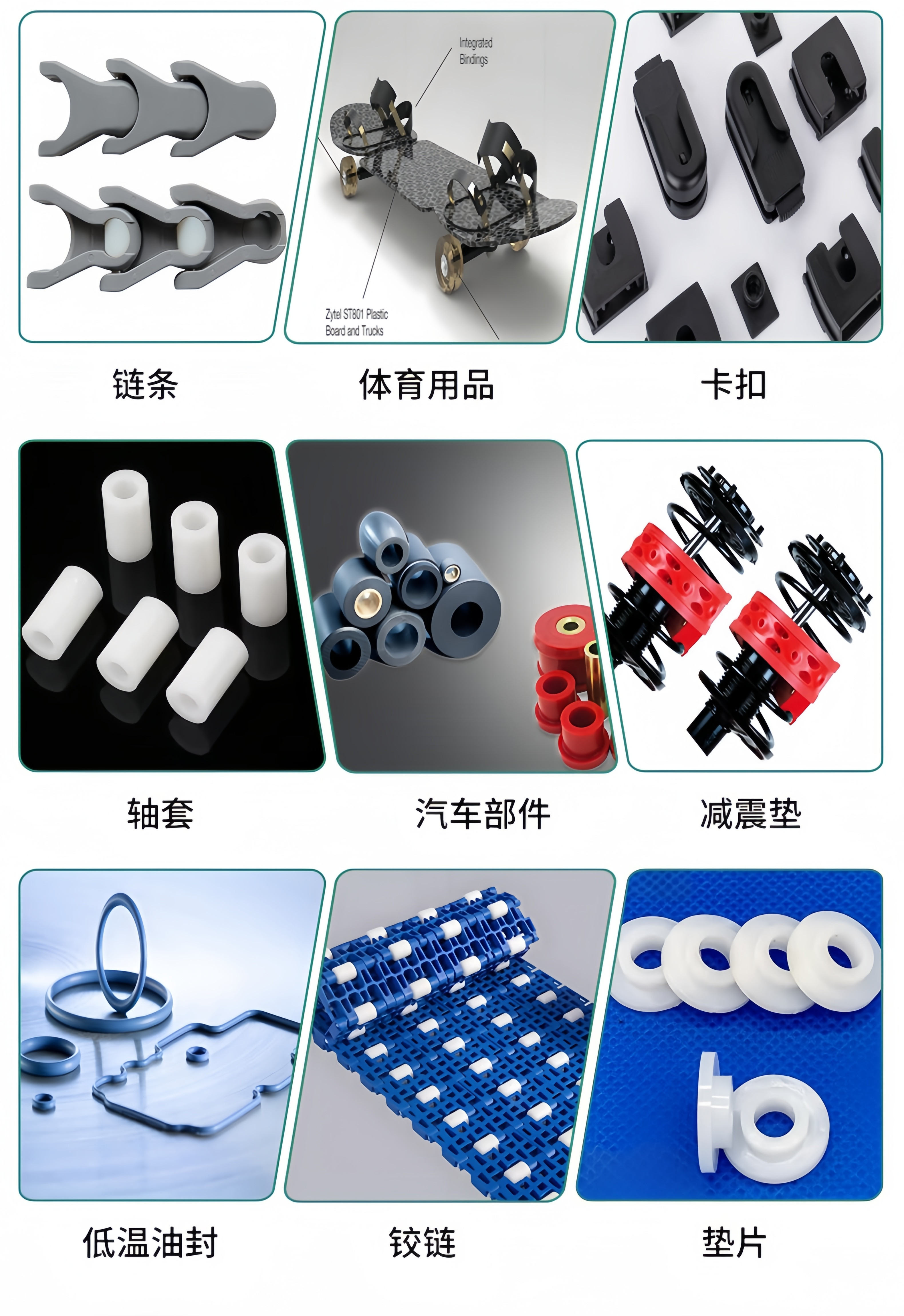 - 传动部件:链条、传送带、滑动轴承,依托耐磨性和自润滑性。