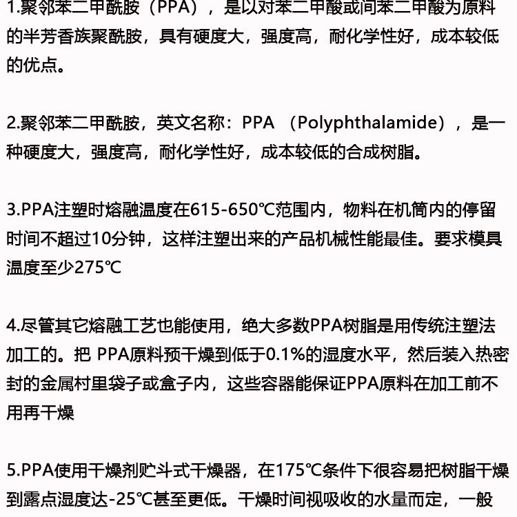 - 材料组成 :22%玻纤增强的高反射白色级PPA树脂,具有高结晶度,适用于水冷模具成型 。